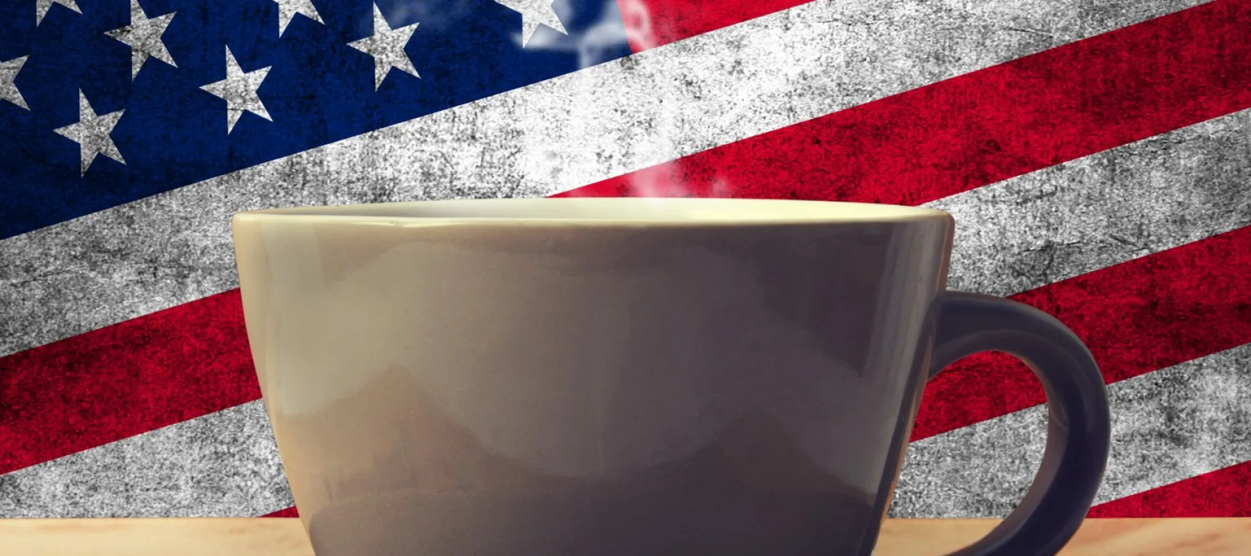 Top view of a coffee grinder with beans and a purple cup of coffee with American flag foam art on wooden table