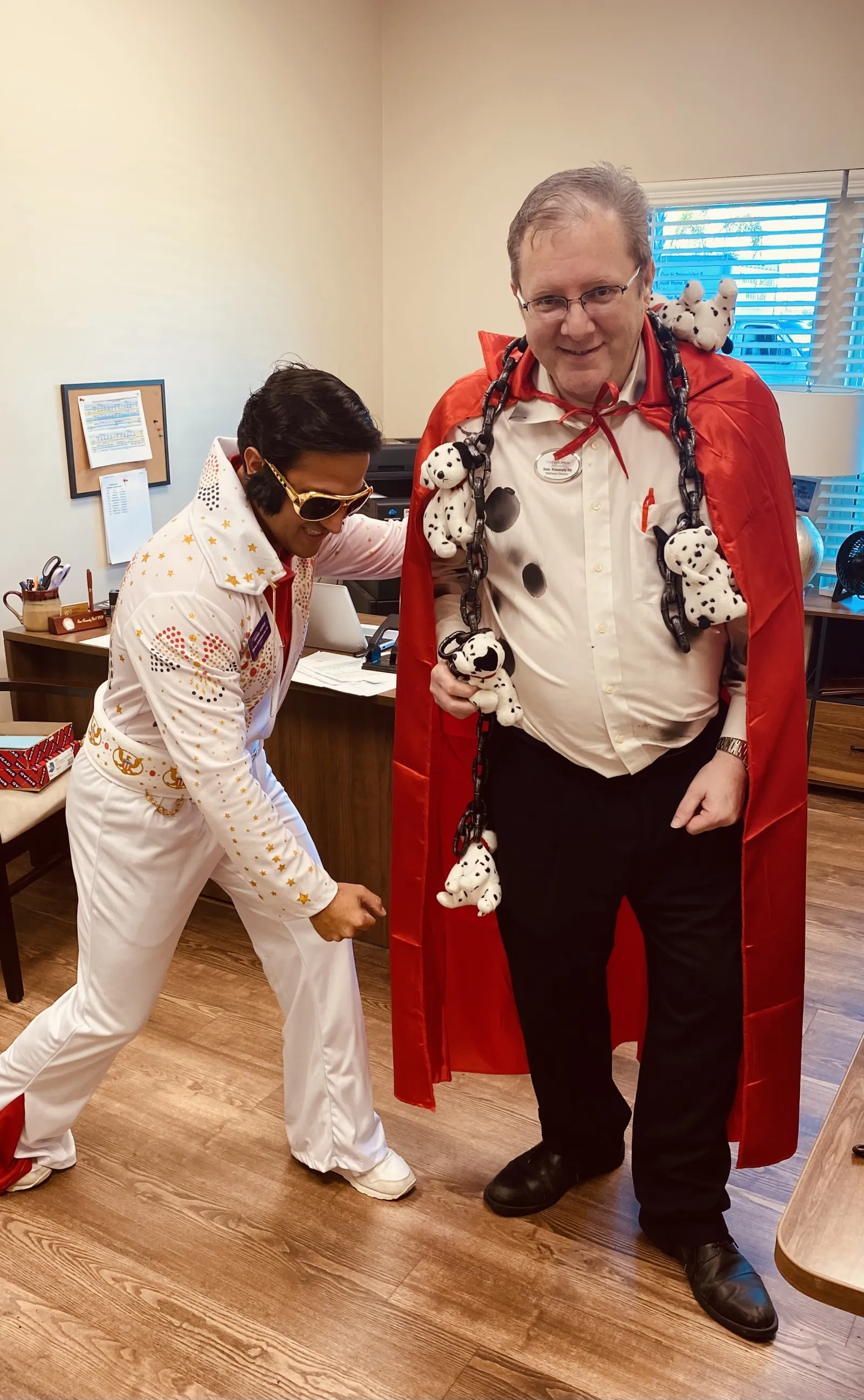 Today, Sean is a valued member of the team—and the camaraderie between him and Carlos runs deep. One favorite throwback? A Halloween photo featuring Carlos dressed as Elvis, and Sean dressed as… well, we're not quite sure what. But he's in a red cape, draped in stuffed dalmatians, and wearing a grin that says it all: these two already had the kind of rapport that makes a great team.